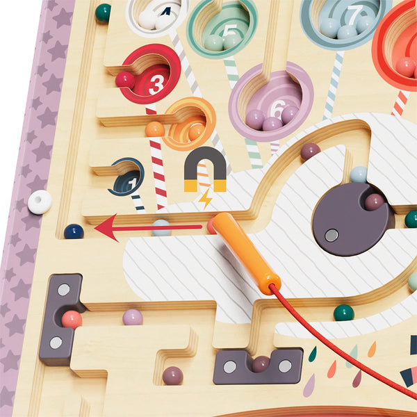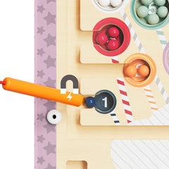 - À l'aide d'un stylo magnétique, ils guideront des billes à travers un charmant jardin, en associant les couleurs et en comptant tout au long du parcours pour favoriser le développement cognitif.