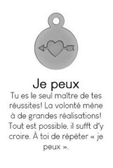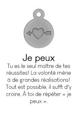 "Je peux"Tu es le seul maître de tes réussites! La volonté mène à de grandes réalisations! Tout est possible, il suffit d'y croire. À toi de répéter "Je peux". Breloque avec...