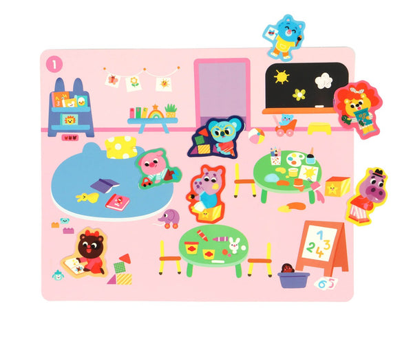 - La pochette propose 4 décors à animer à l'aide de 50 autocollants en relief repositionnables à l'infini, faciles à manipuler par des petites mains.