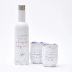 - Cet ensemble de bouteille et verres en acier inoxydable est une invitation à ralentir, respirer… et profiter du moment. Il comprend une bouteille de 750 ml ainsi que deux verres assortis de 350 ml, tous conçus en acier inoxydable de qualité, à double paroi avec isolation sous vide pour garder vos breuvages à la température idéale, chaude ou froide.