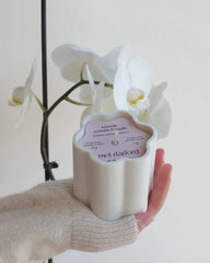 Bougie fabriquée à la main au Québec à partir de cire de soya 100% naturelle et coulée dans un joli pot en céramique en forme de fleur. L'odeur Amande, orchidée &...