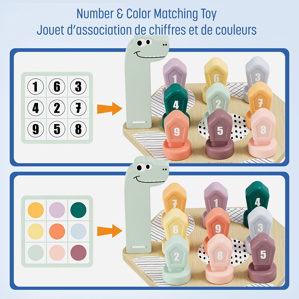 • Ce jouet Montessori en bois comprend un dinosaure sympathique, 9 bouchons de bouteille colorés et 10 cartes recto-verso pour aider les enfants à développer des compétences essentielles.