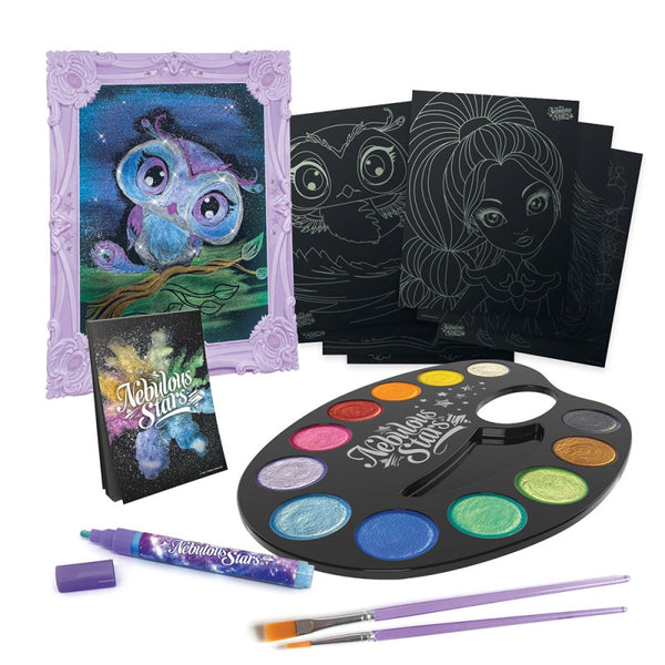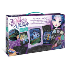 Ce n’est que dans le noir que les étoiles brillent! Cet ensemble comprends des tableaux noirs d’aquarelle magique qui brillent dans le noir, une palette de peinture au couleurs métalliques et bien plus. Tout ce qu’il te faut pour créer des œuvres dignes d’un ciel étoilé!