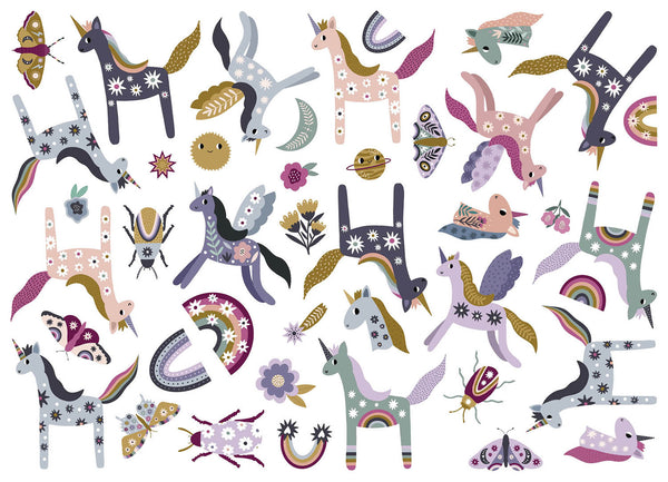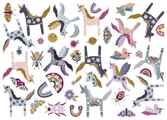 Une magnifique pochette contenant 50 tatouages sur le thème incontournable des licornes avec le superbe design de Paper Picnic.
