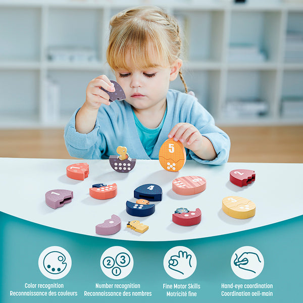 - Nos œufs de dinosaure en bois à associer par numéro et par couleur aident les tout-petits à développer des compétences essentielles, notamment la reconnaissance des couleurs, le comptage et la résolution de problèmes.