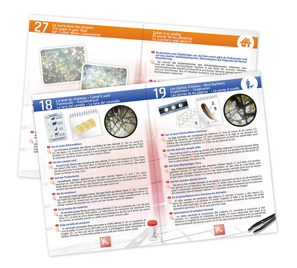 Feuille d'instructions disponible en 6 langues avec 30 expériences pour apprendre à préparer des lames, à prélever des échantillons, à ajuster le microscope et la lumière.